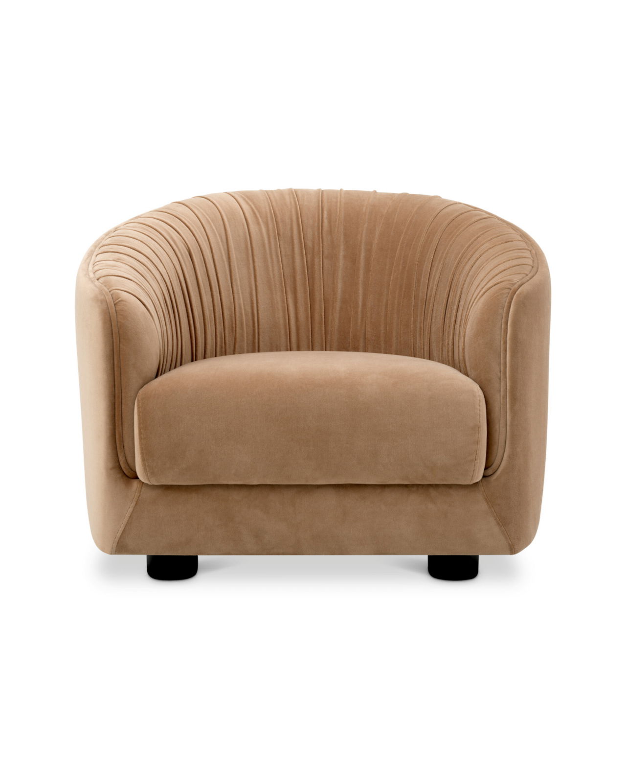 En lyxig fåtölj i varm Amaro camel med mjuk, sammetslen känsla och stilren design.